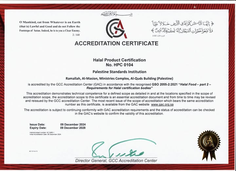 - Accreditation of the Palestinian Halal Certificate No. HPC 0104 in accordance with the international standard GSO 2055-2:2021, “Halal Food – Part 2: Requirements for Halal Certification Bodies.”