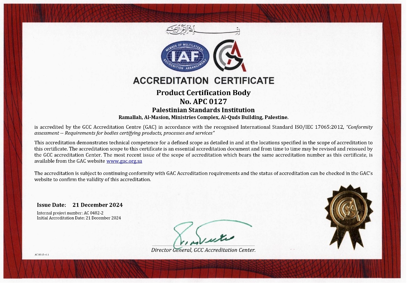 - Accreditation of the Palestinian Quality Certificate No. APC 0127 in accordance with the international standard ISO 17065 and other related international standards.